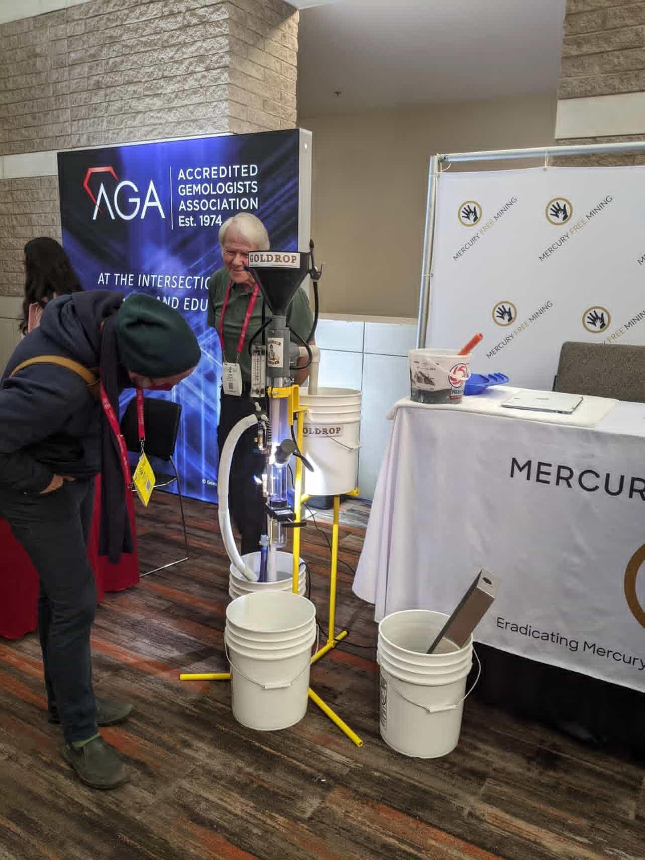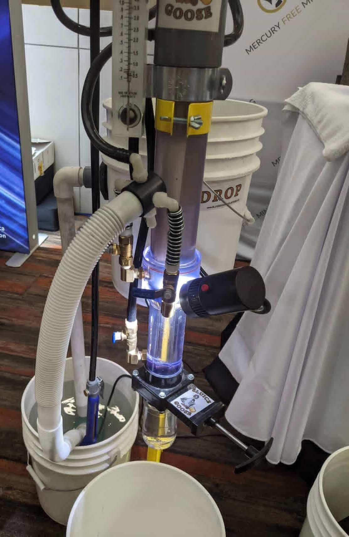 The Free Mercury Gold Extraction Machine is a portable, 12-volt, hydraulic, fluid-bed concentrator designed for high-efficiency, mercury-free, fine-gold recovery. It utilizes a vertical water flow, or “elutriation” process, and a vortex spinner to separate gold from concentrates. It handles up to 3/16-inch classified material, capturing flour gold as fine as 400 mesh, and is designed to replace traditional panning and shaker tables.